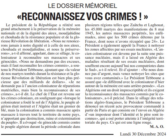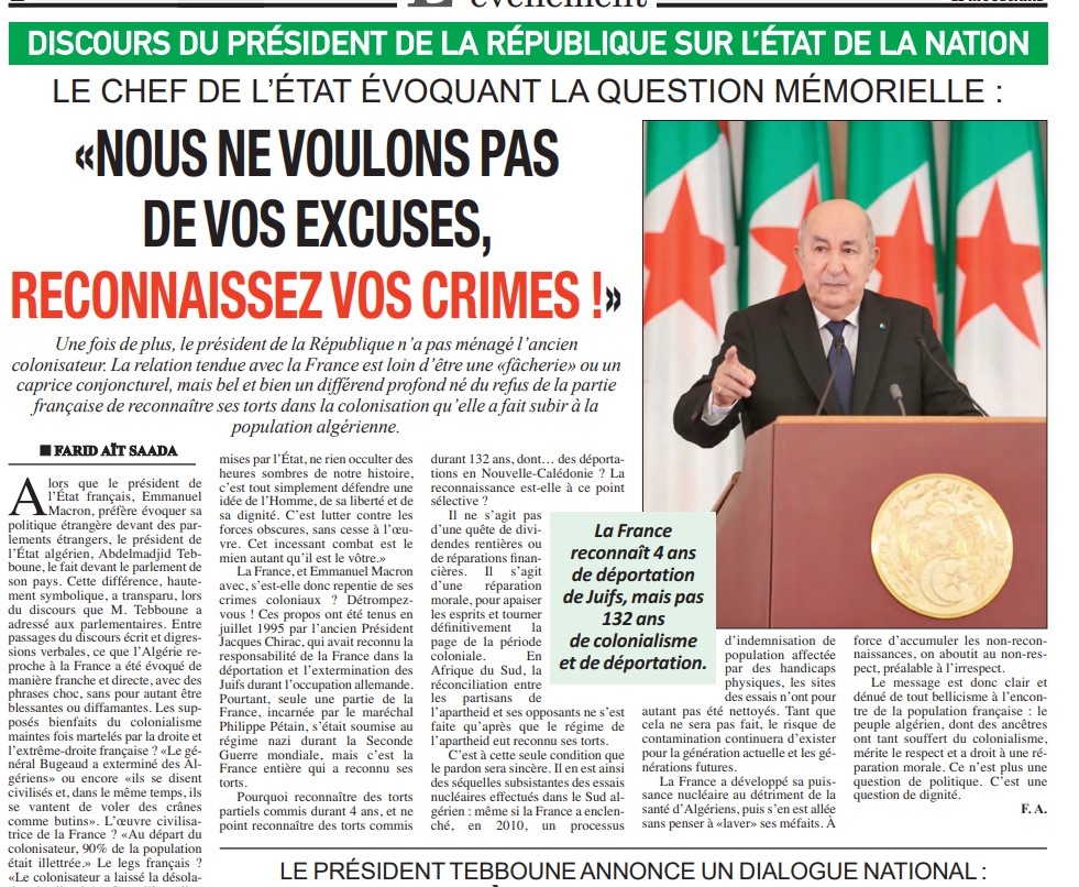 Président Tebboune à la France : « Reconnaissez vos crimes ! »
